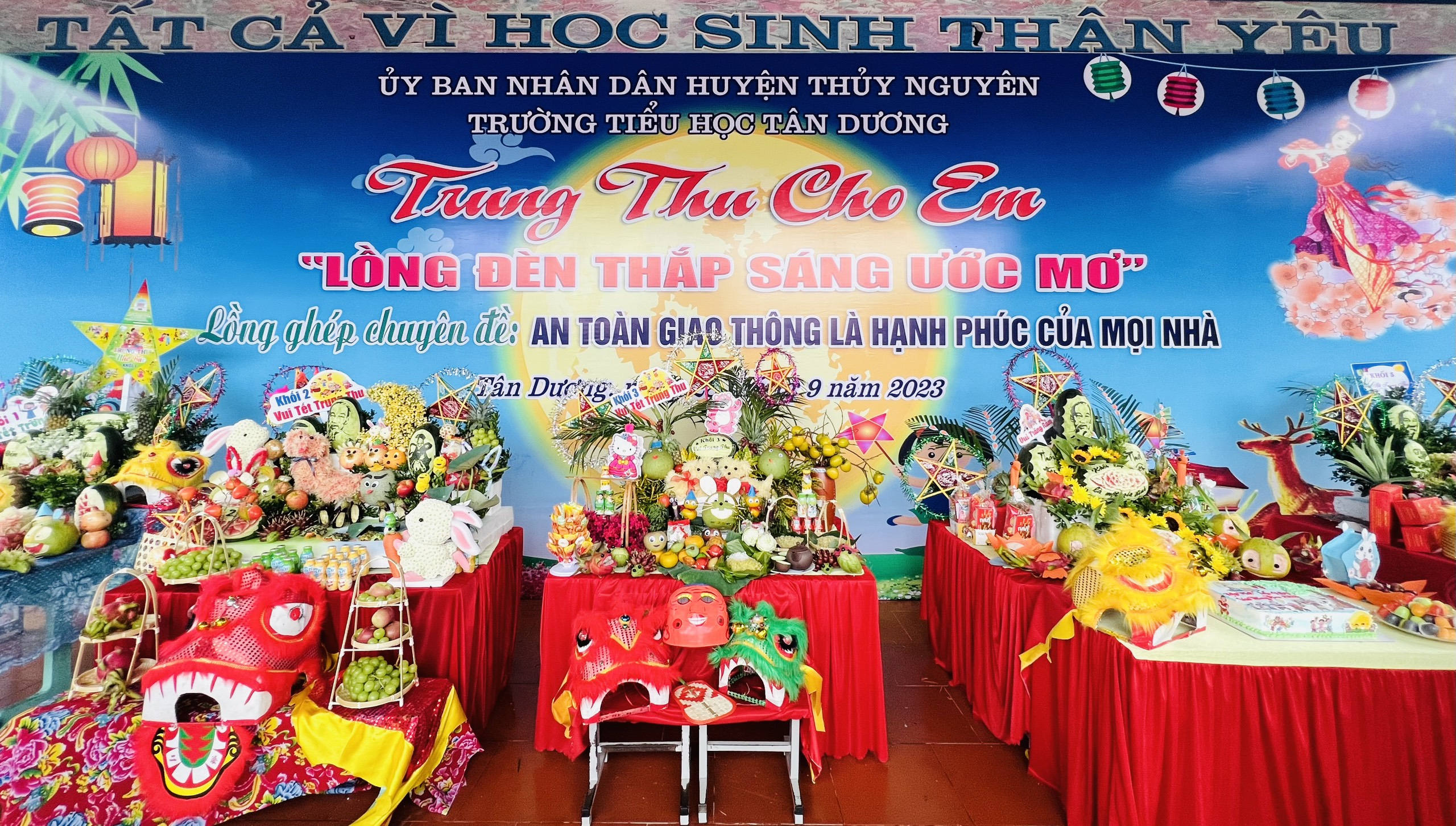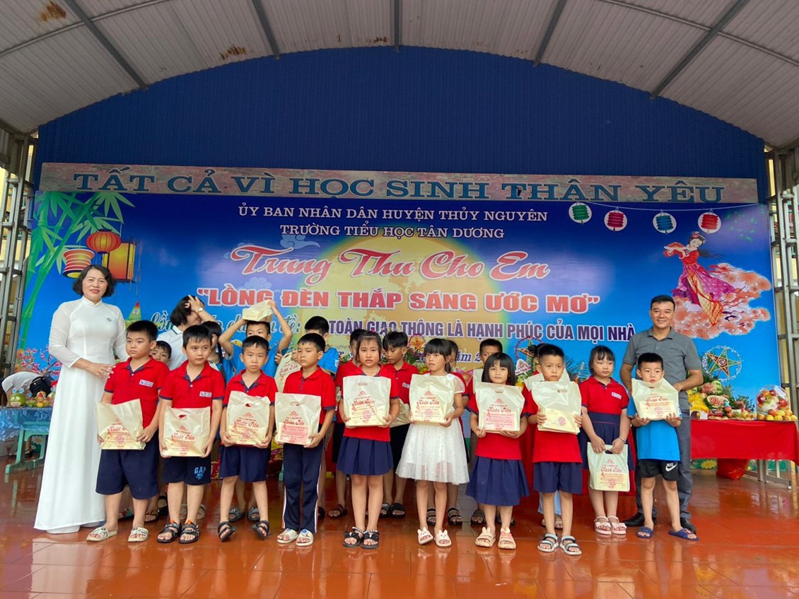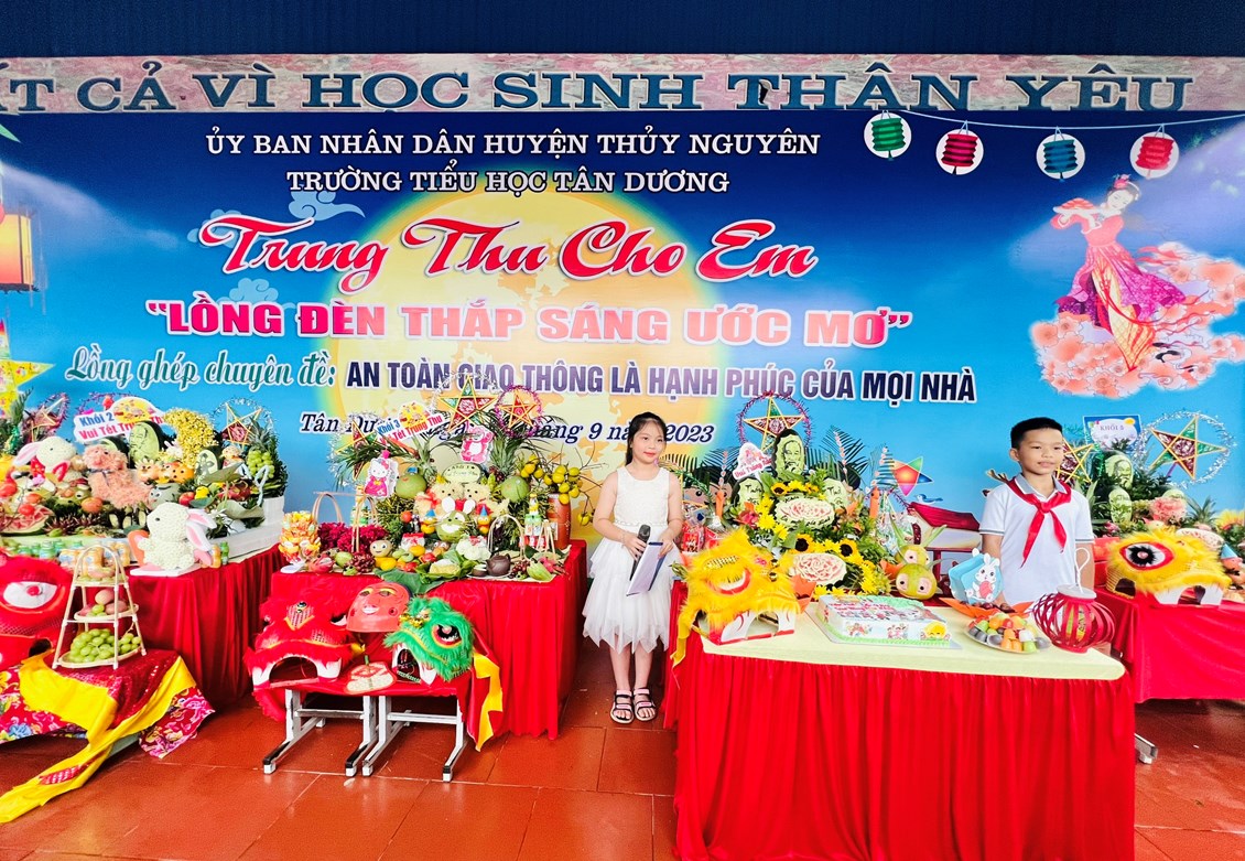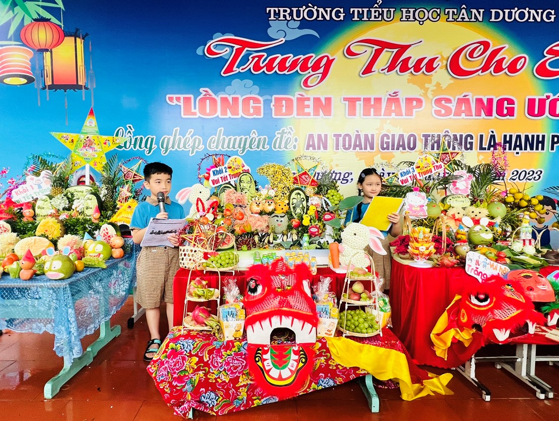 Hoà chung với không khí tưng bừng phấn khởi của thiếu nhi cả nước chào đón tết Trung thu, chiều ngày 28/09/2023 (tức ngày 14 tháng 8 âm lịch) trường Tiểu học Tân Dương tưng bừng tổ chức chương trình Trung thu cho em “Lồng đèn thắp sáng ước mơ” và lồng ghép chuyên đề An toàn giao thông là hạnh phúc của mọi nhà cho các bạn thiếu nhi. Bằng hệ thống câu hỏi mà chú Cuội, chị Hằng đưa ra để tìm hiểu ngày tết Trung thu và những kiến thức về ATGT gắn liền với cuộc sống hàng ngày, các em đã rất hào hứng, tích cực tham gia. Thông qua chương trình giao lưu, giáo dục cho các em ý thức, trách nhiệm với bản thân khi tham gia giao thông là bào vệ chính mình và xã hội.