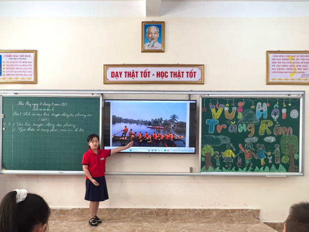 Tiết học diễn ra hết sức vui vẻ và hào hứng với nhiều hình thức tổ chức phong phú như cá nhân, nhóm đôi, nhóm 4, trò chơi Rung chuông vàng… giúp học sinh tự tin giới thiệu, quảng bá những nét đẹp của quê hương mình với bạn bè trong và ngoài nước. Từ đó, giáo viên khéo léo giáo dục học sinh niềm tự hào, tình yêu quê hương, đất nước bằng những việc làm cụ thể để giữ gìn và xây dựng quê hương mình càng giàu đẹp hơn.
