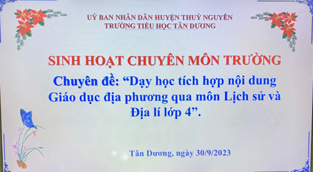 Thực hiện kế hoạch chuyên môn tháng 9 của nhà trường, sáng thứ Bảy ngày 30/9/2023, Trường Tiểu học Tân Dương tổ chức chuyên đề: “Dạy học tích hợp nội dung Giáo dục địa phương” vào dạy môn Lịch sử và Địa lý lớp 4, đáp ứng chương trình GDPT 2018.