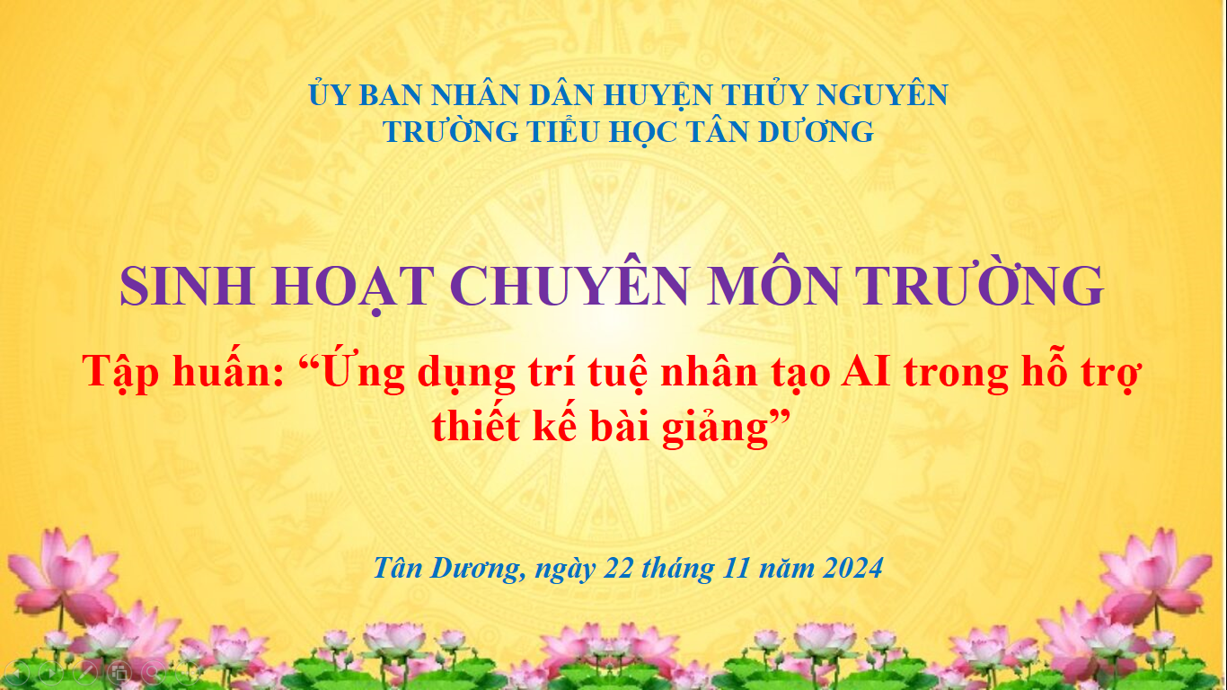 Thực hiện theo kế hoạch chuyên môn tháng 11 và được sự nhất trí của ban giám hiệu, chiều ngày 22/11/2024 trường Tiểu học Tân Dương đã tổ chức cho 100% giáo viên toàn trường tham gia tập huấn: Ứng dụng trí tuệ nhân tạo AI trong hỗ trợ thiết kế bài giảng tại phòng học thông minh.