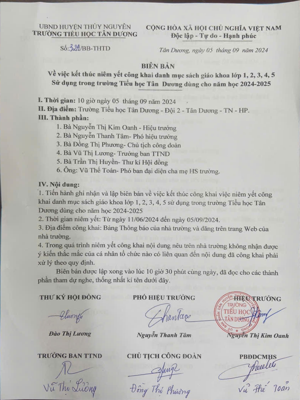 Biên bản: V/v kết thúc niêm yết công khai danh mục sách giáo khoa lớp 1, 2, 3, 4, 5